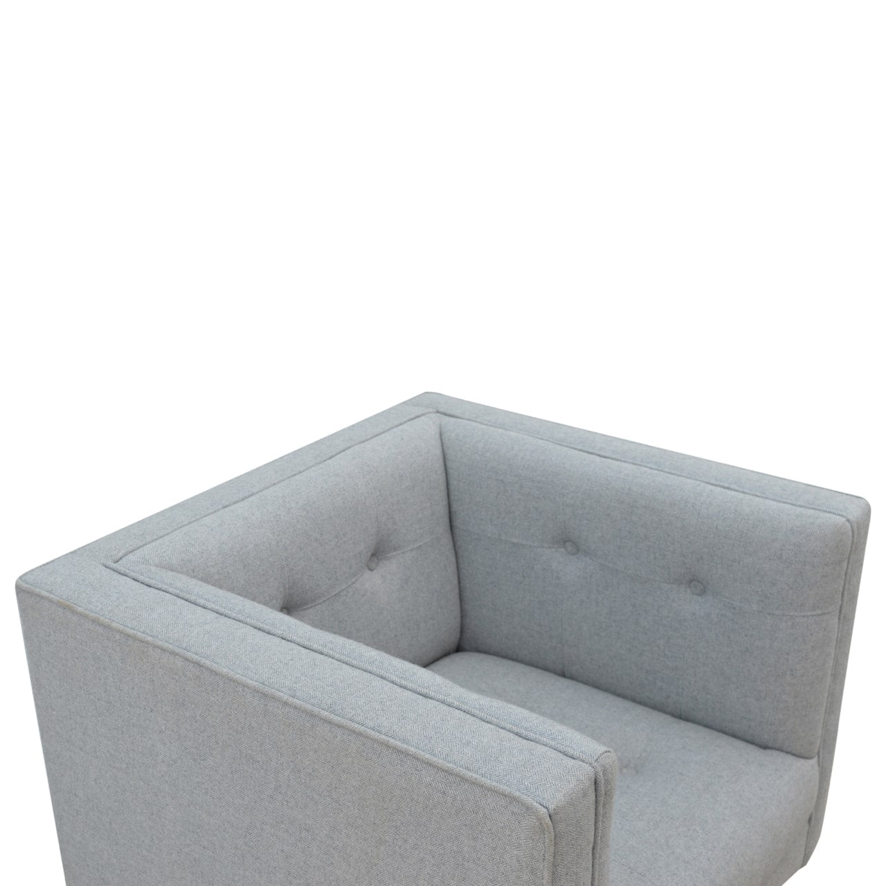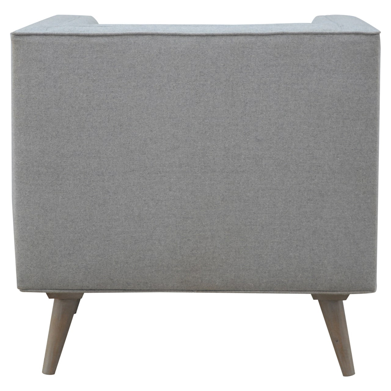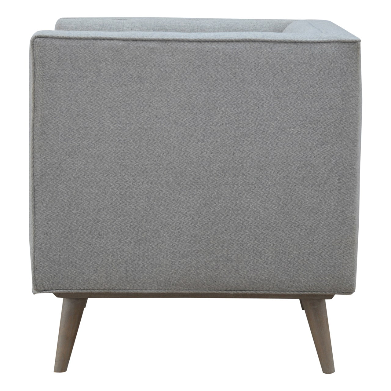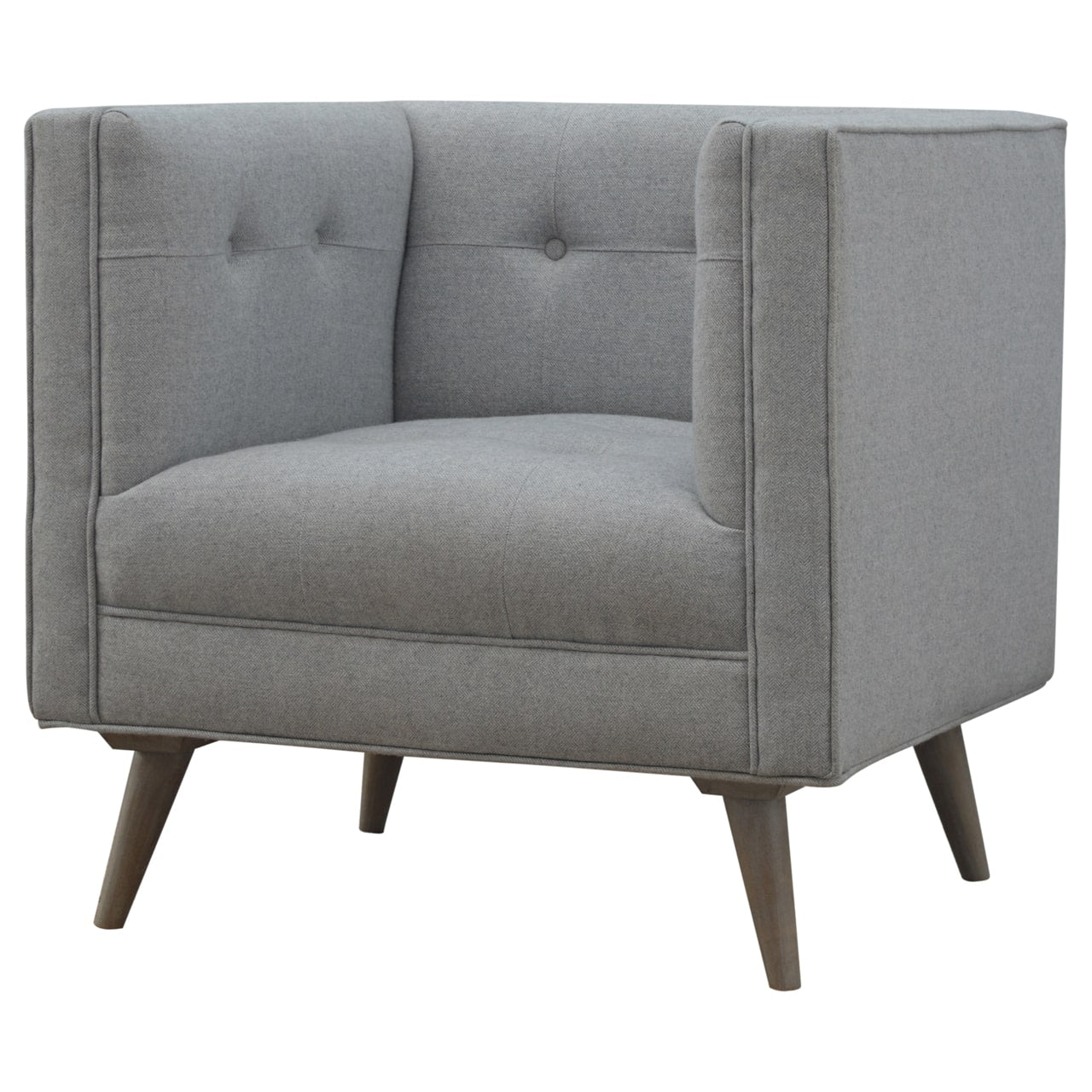 This product features 100% solid mango wood, crafted by hand with care. It boasts a natural oak-ish finish legs complemented by grey tweed upholstery.