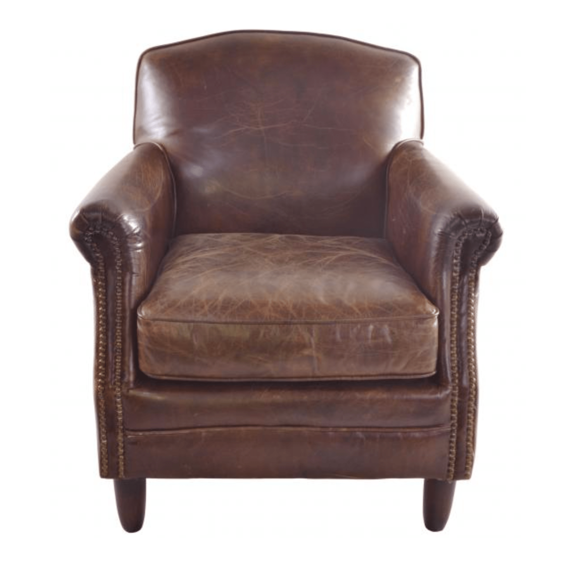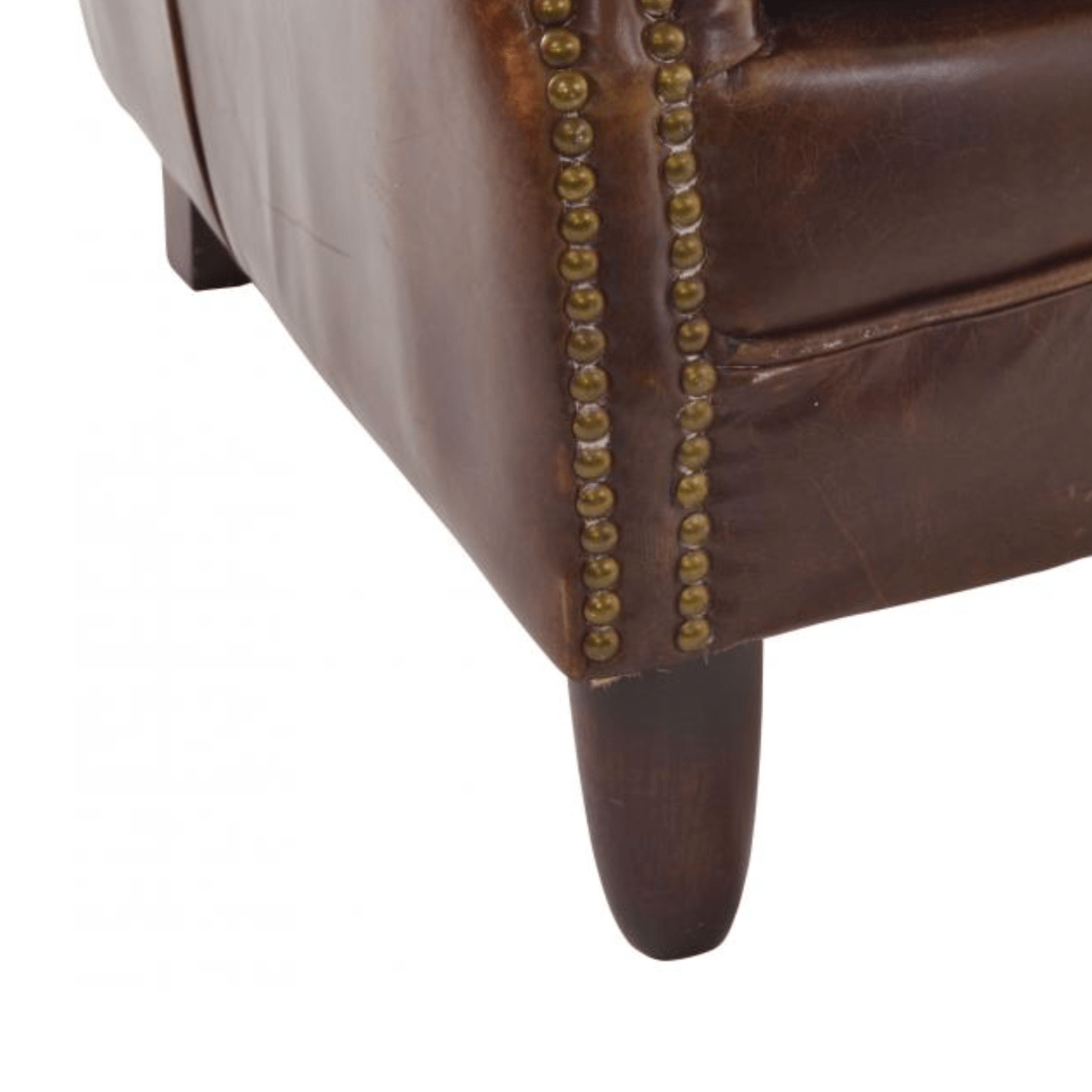 Our Vintage Studded Front Leather Chair offers timeless elegance and unparalleled comfort. Upholstered in high-quality, luxurious leather, it features cushioned, gently splayed armrests, a gracefully curved back, and a deep, plush seat. The sturdy timber frame and solid wood legs ensure lasting durability, making it a reliable and stylish addition to any home.