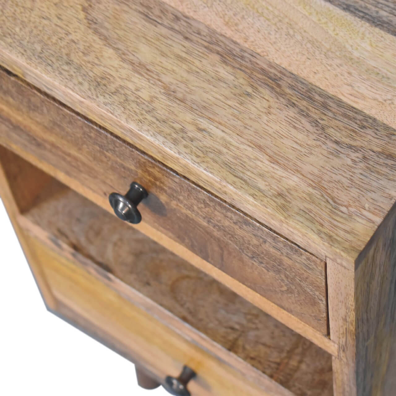 Cut-Out Narrow Bedside Table with 2 Drawers and Open Slot, Mango Wood