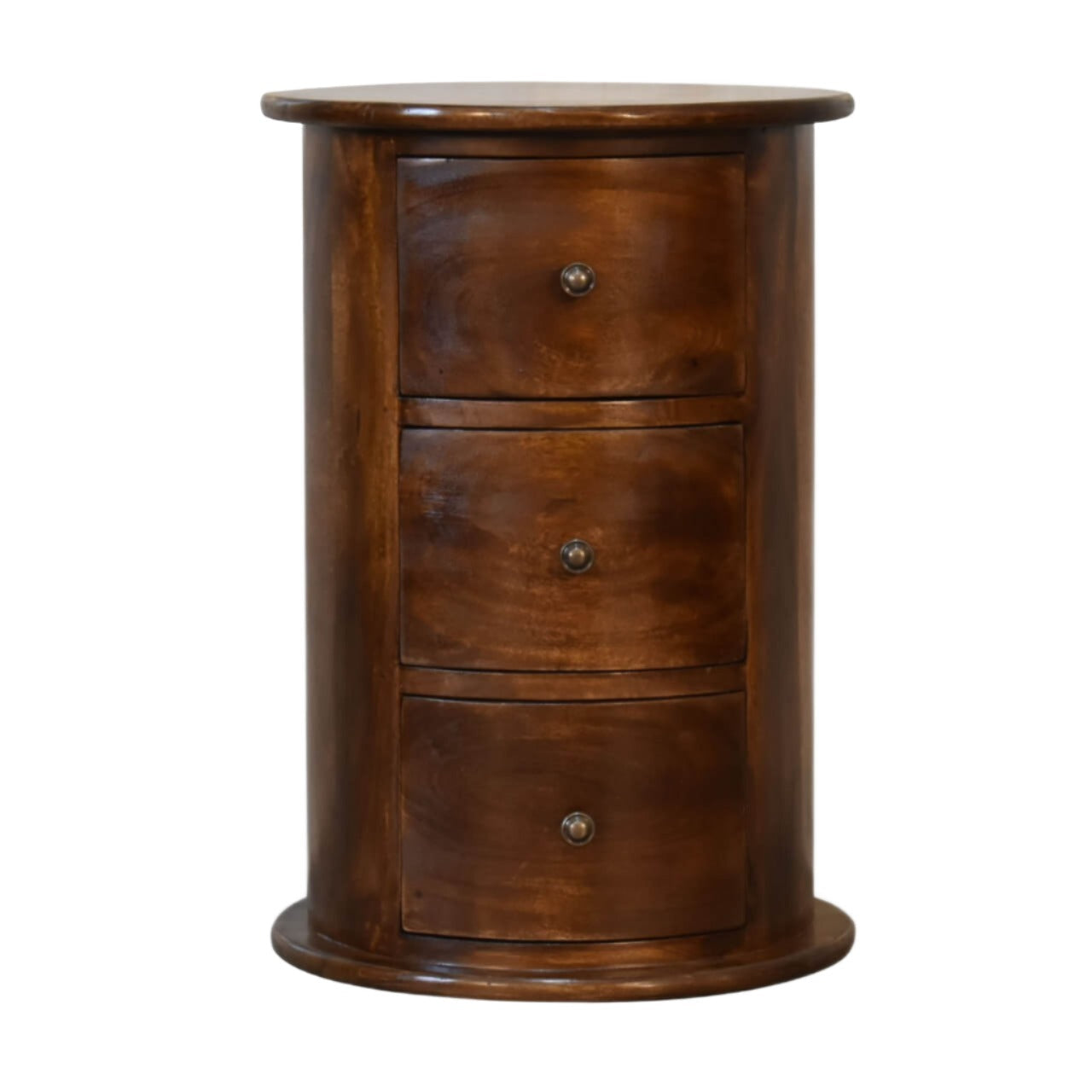 Crafted entirely from 100% solid mango wood, this beautiful round drum chest boasts a fine chestnut finish and shiny knobs on its three spacious drawers, making it a stylish and functional storage solution.