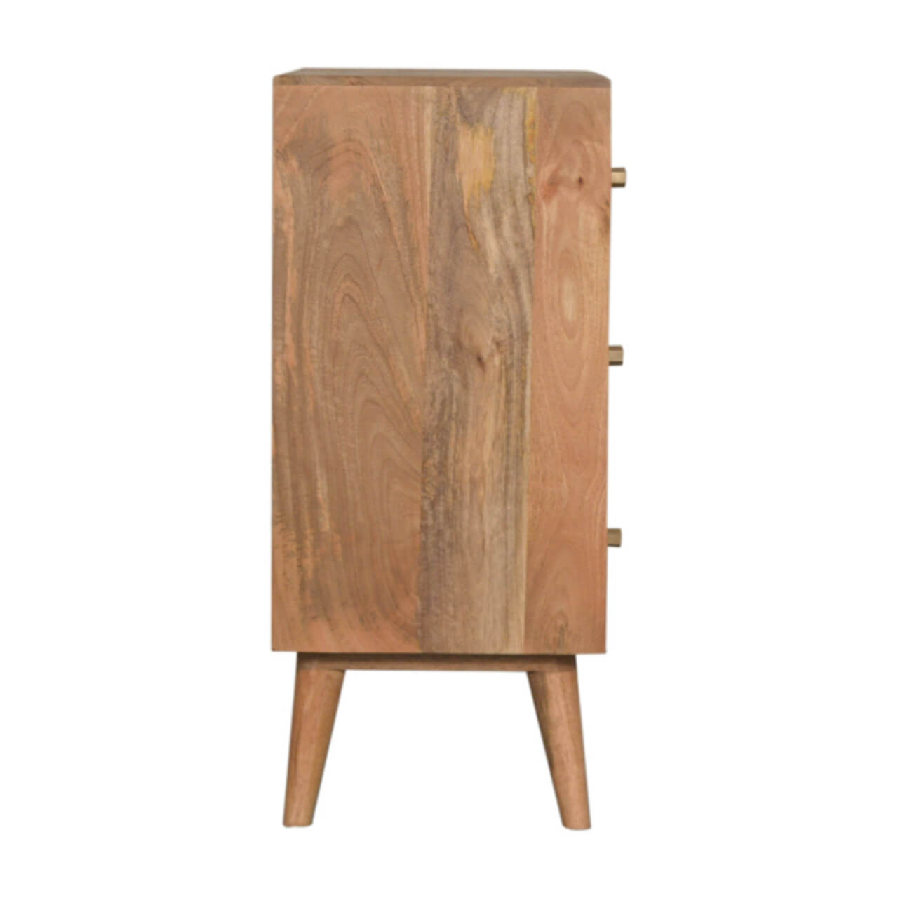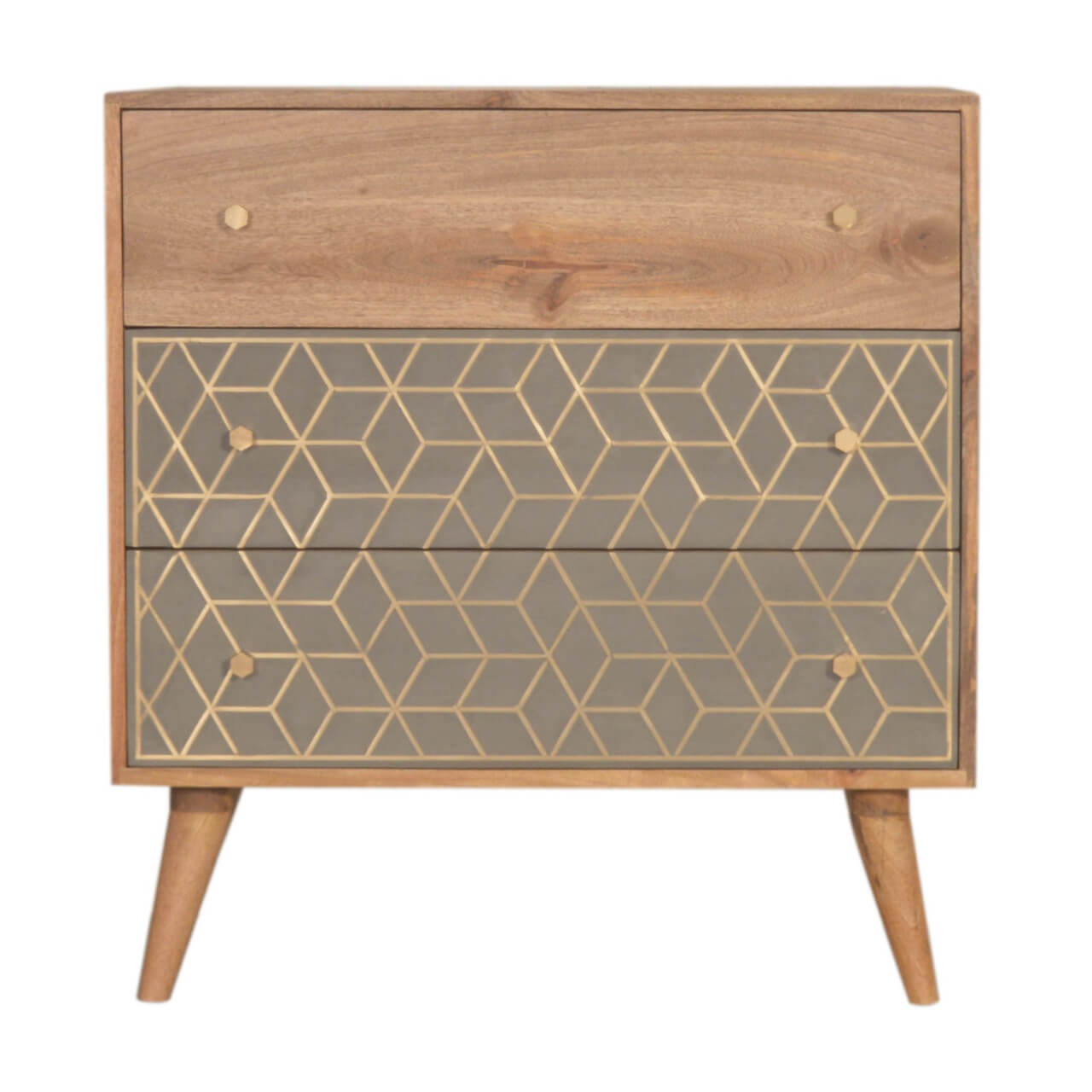 Mango Wood Dice 3-Drawer Chest with Brass Inlay and Cement Accents, Oak Finish