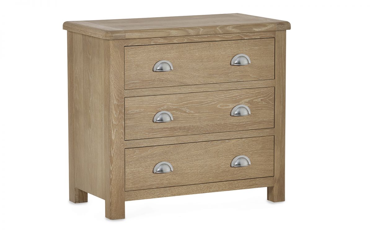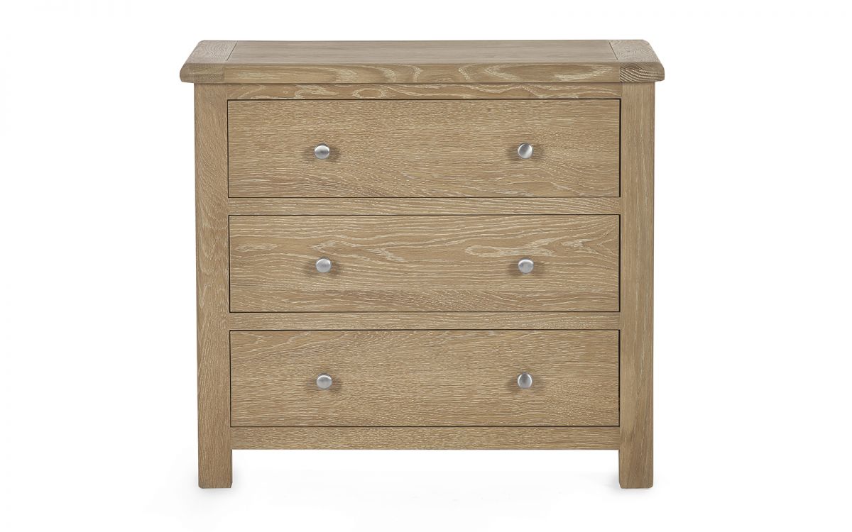 The Memphis Limed Oak 3-Chest is a beautifully crafted piece that combines classic elegance with modern design. In a stunning limed oak finish with delicately curved edges, it offers a touch of sophistication to your bedroom. Its spacious three drawers provide ample storage, keeping your space neat and tidy.