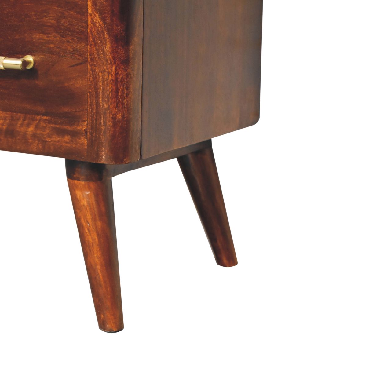 Organise your space in style with the Valen Wooden 3 Drawer Chest. Handcrafted from 100% solid mango wood and boasting a rich chestnut finish, this chest offers both durability and elegance. Its 3 spacious drawers provide ample storage, while the Nordic-style legs and shiny gold t-bar handles add a touch of sophistication.