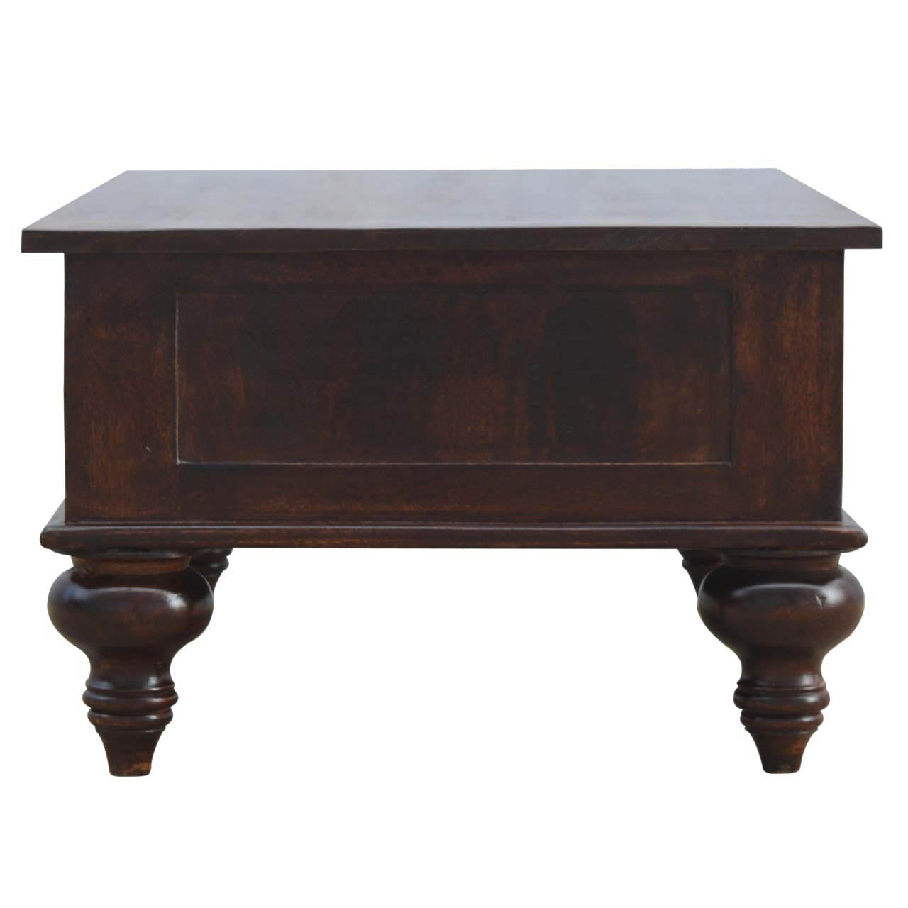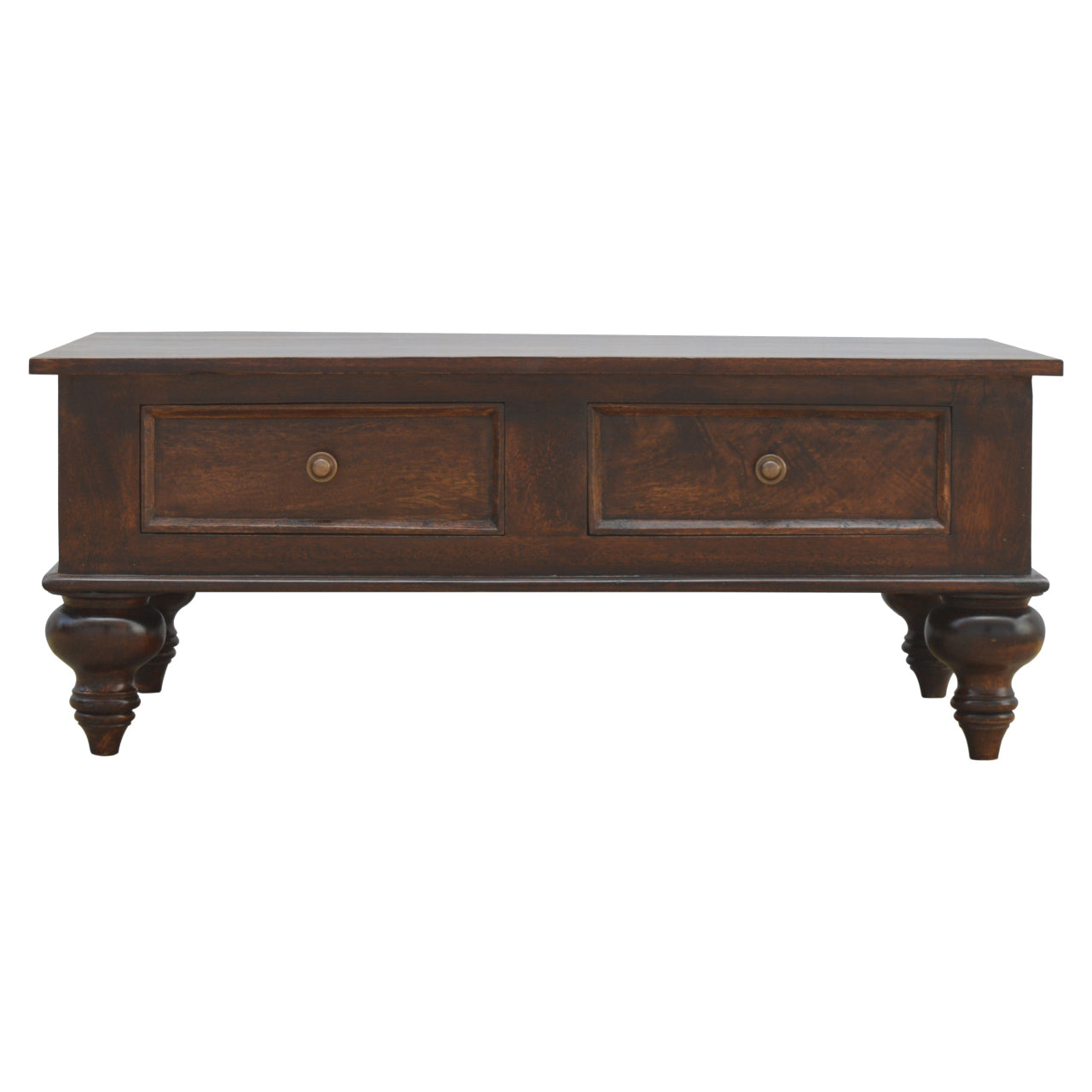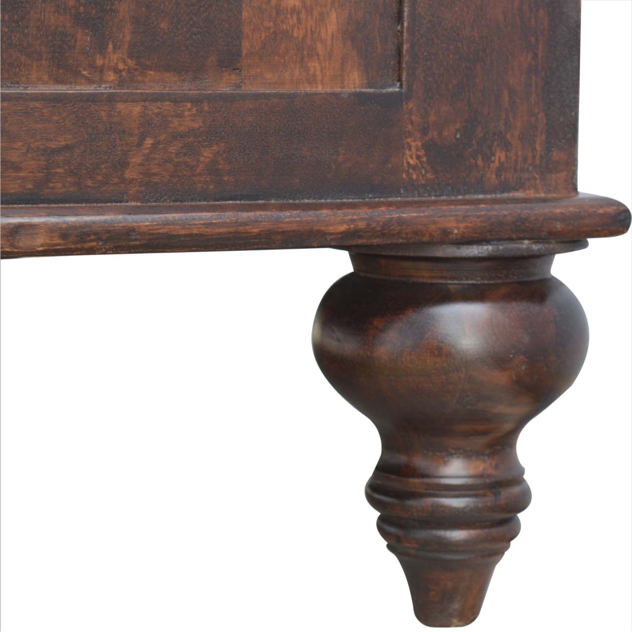Its stunning light walnut finish and shiny knob handles bring a touch of elegance to any room. The hand turned feet add a unique touch while the spacious drawers offer ample storage.