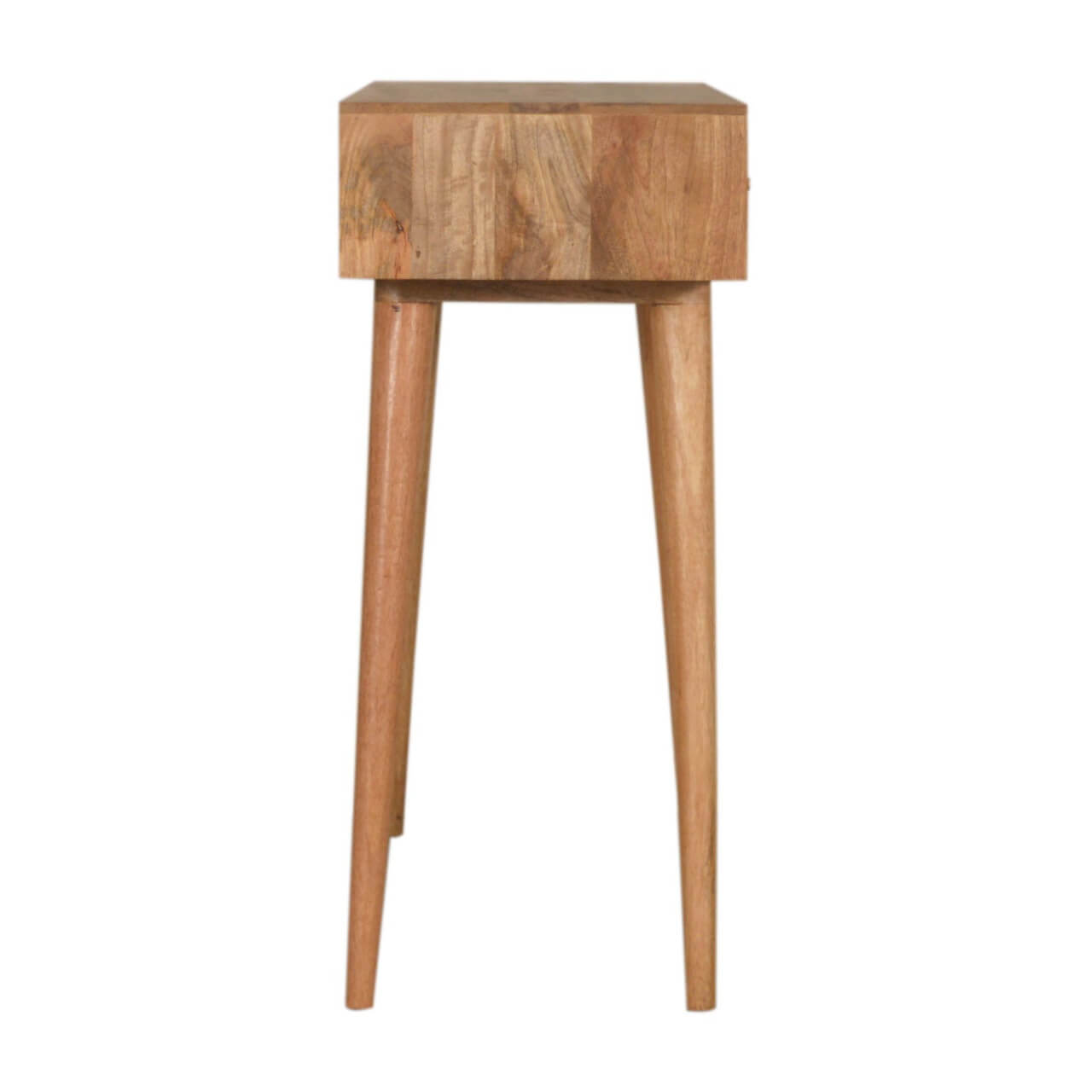 The Acadia Console Table features two hand painted drawers and a mango wood construction, making it a sturdy and stylish addition to any living space. The combination of wood and paint creates a durable and visually pleasing design.