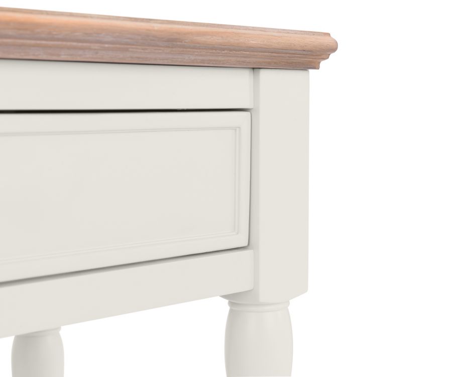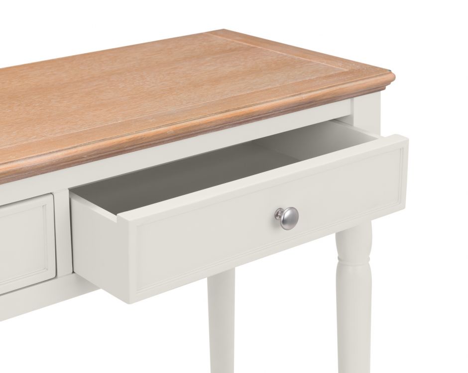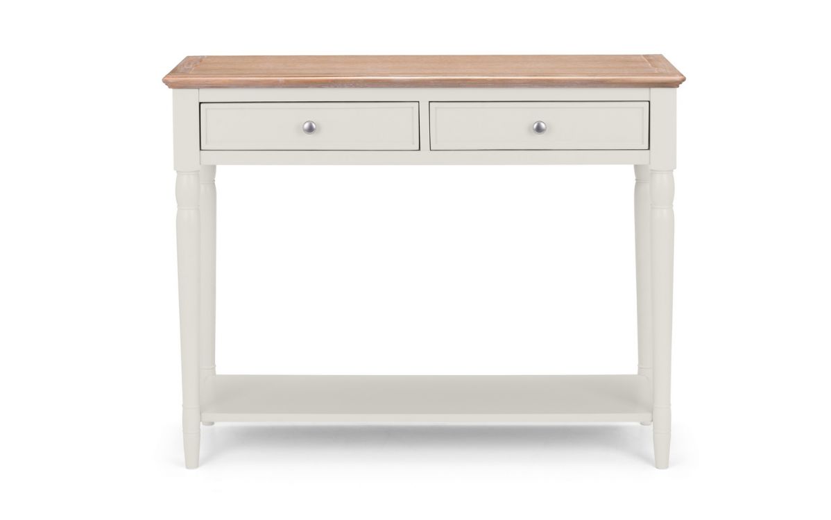 This timeless console table features an authentic antique design with classic turned legs, making it perfect for both contemporary and traditional homes. Finished in grey lacquer with a limed oak effect top, the Provence table offers additional storage with two drawers, ideal for keeping keys, wallets, and everyday essentials within reach.