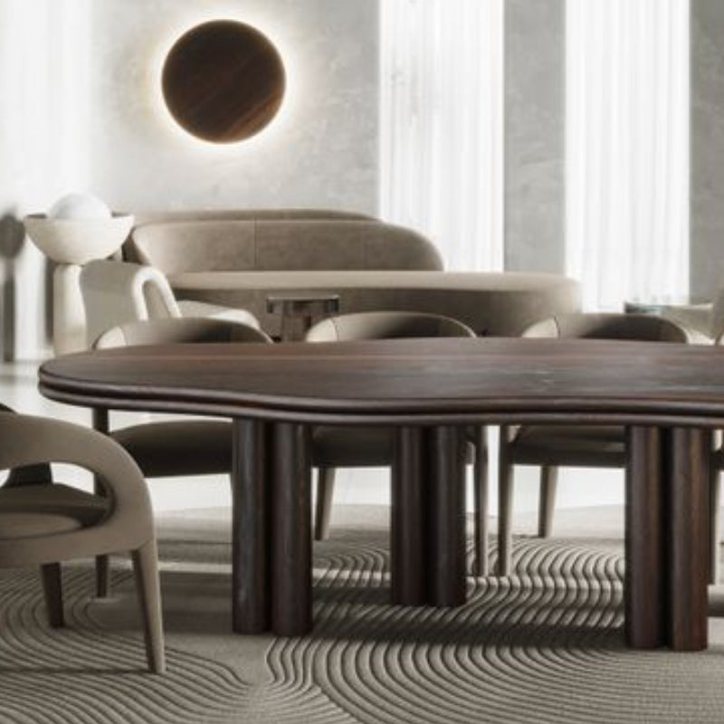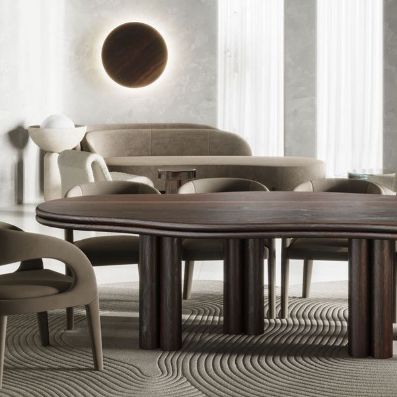 This dining table with a unique design stands out with triple legs made of solid wood, topped with a double top, and handcrafted from oak wood.