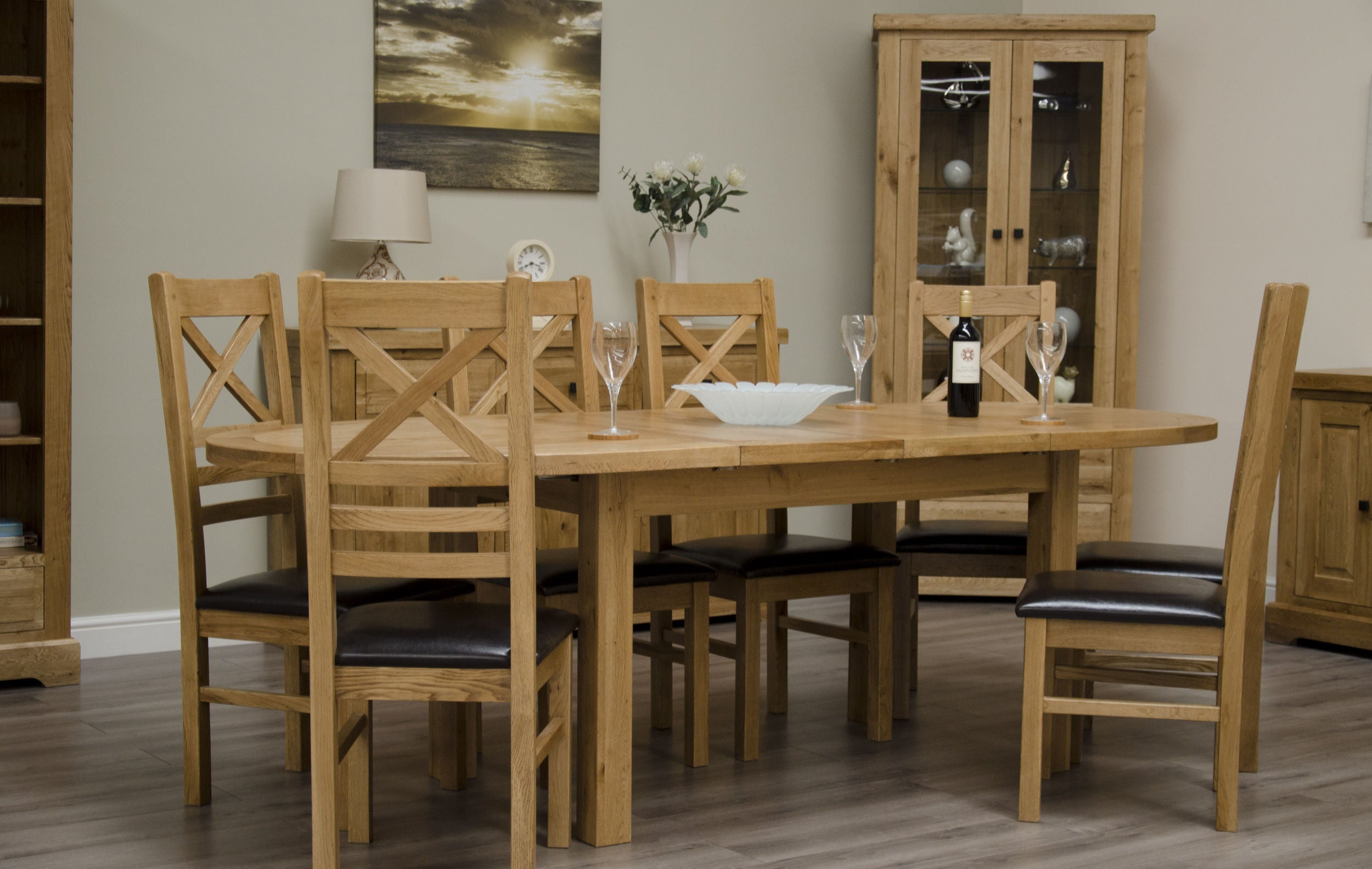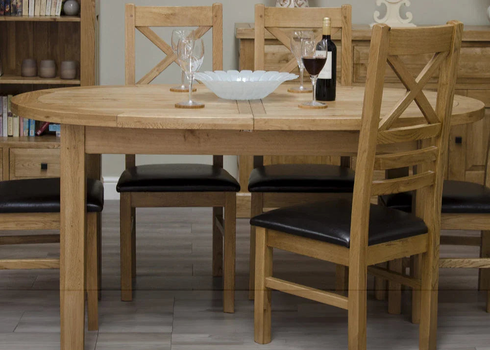 Our Deluxe Oval Twin Leaf Extending Table is crafted from high-quality oak with solid oak engineered center panels, combining durability with timeless elegance. Its unique oval design adds a sophisticated touch to any dining room. The table extends from a minimum length of 167 cm to 207 cm or 247 cm, making it ideal for dinner parties or family gatherings. Finished with a protective lacquer, it comfortably seats 4 to 8 people.