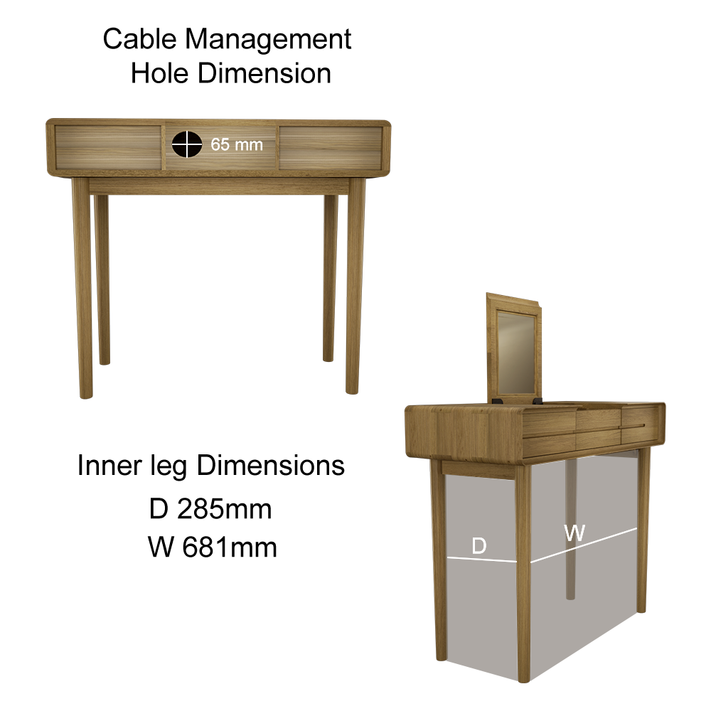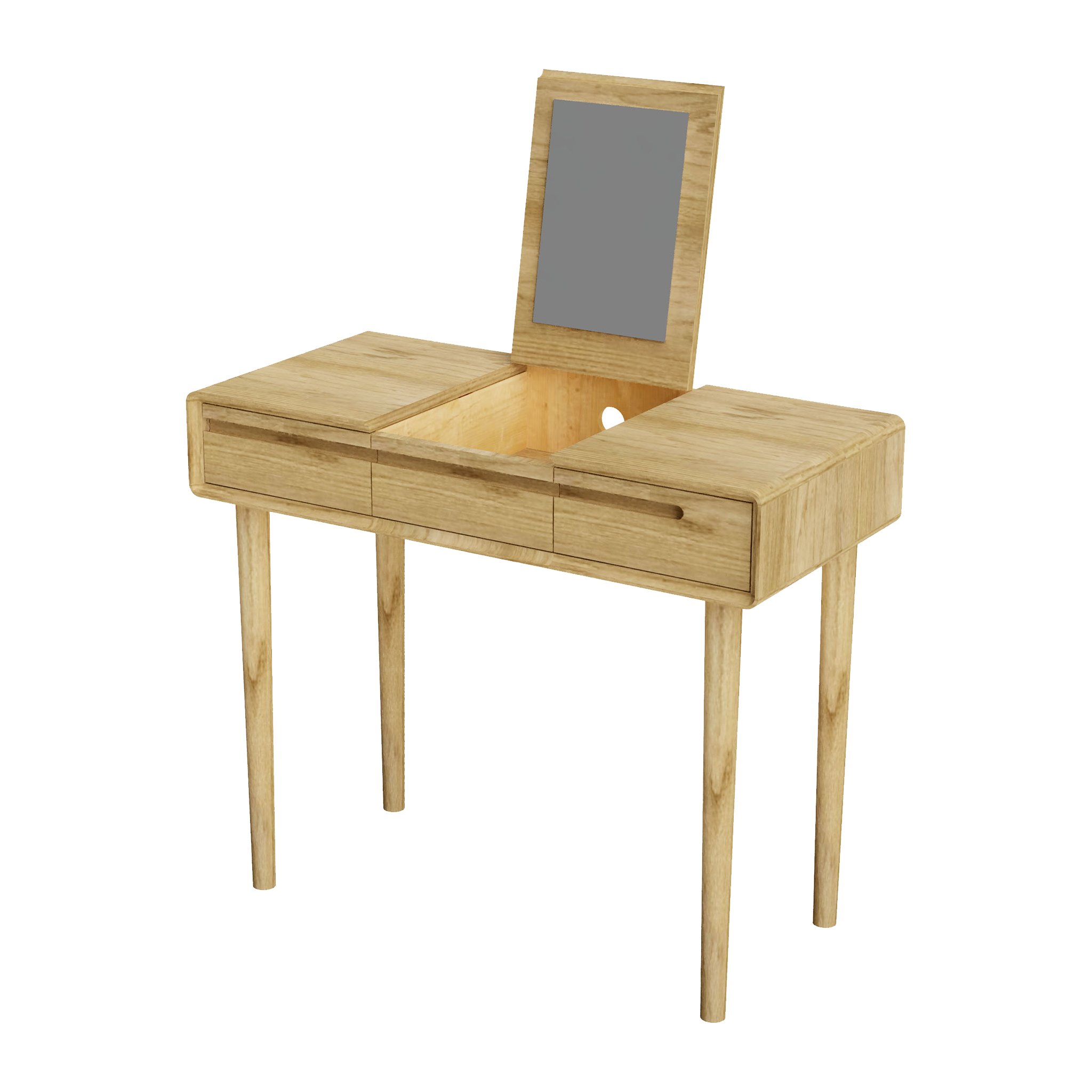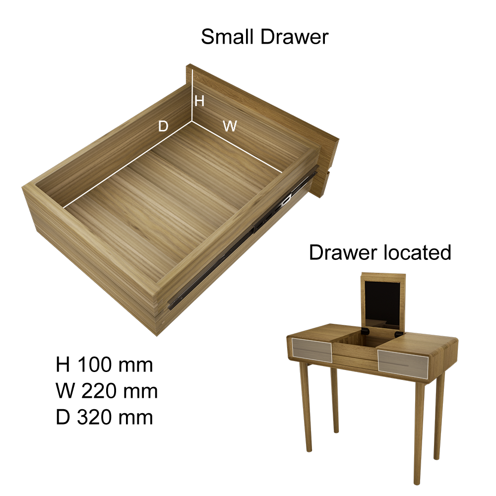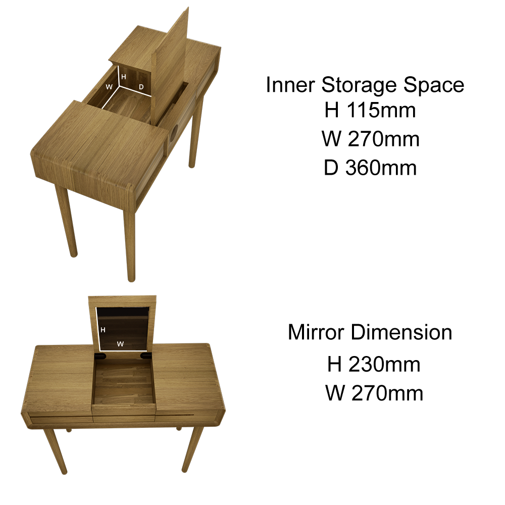 The Scandic Dressing Table with Mirror is made with solid oak and has paulownia drawer boxes & back panels, this 3-drawer table features a mirror that folds into the table for convenience and versatility. Easy glide runners. Clear lacquer finish.