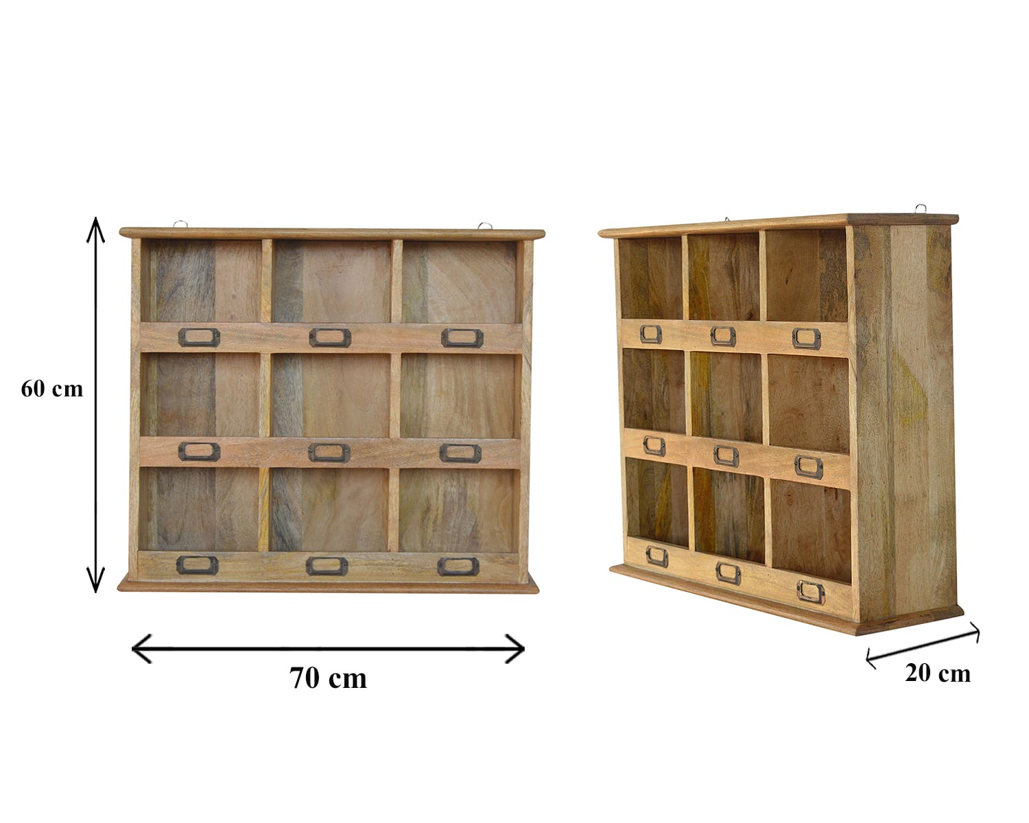 A neo-classic wall-mounted unit featuring nine utility slots for everyday use. This practical solution addresses your storage needs in the kitchen or any other space. Handcrafted with brass-finished metal slots for labeling or numbering items, it is constructed from 100% solid mango wood with a fine oak-ish finish.