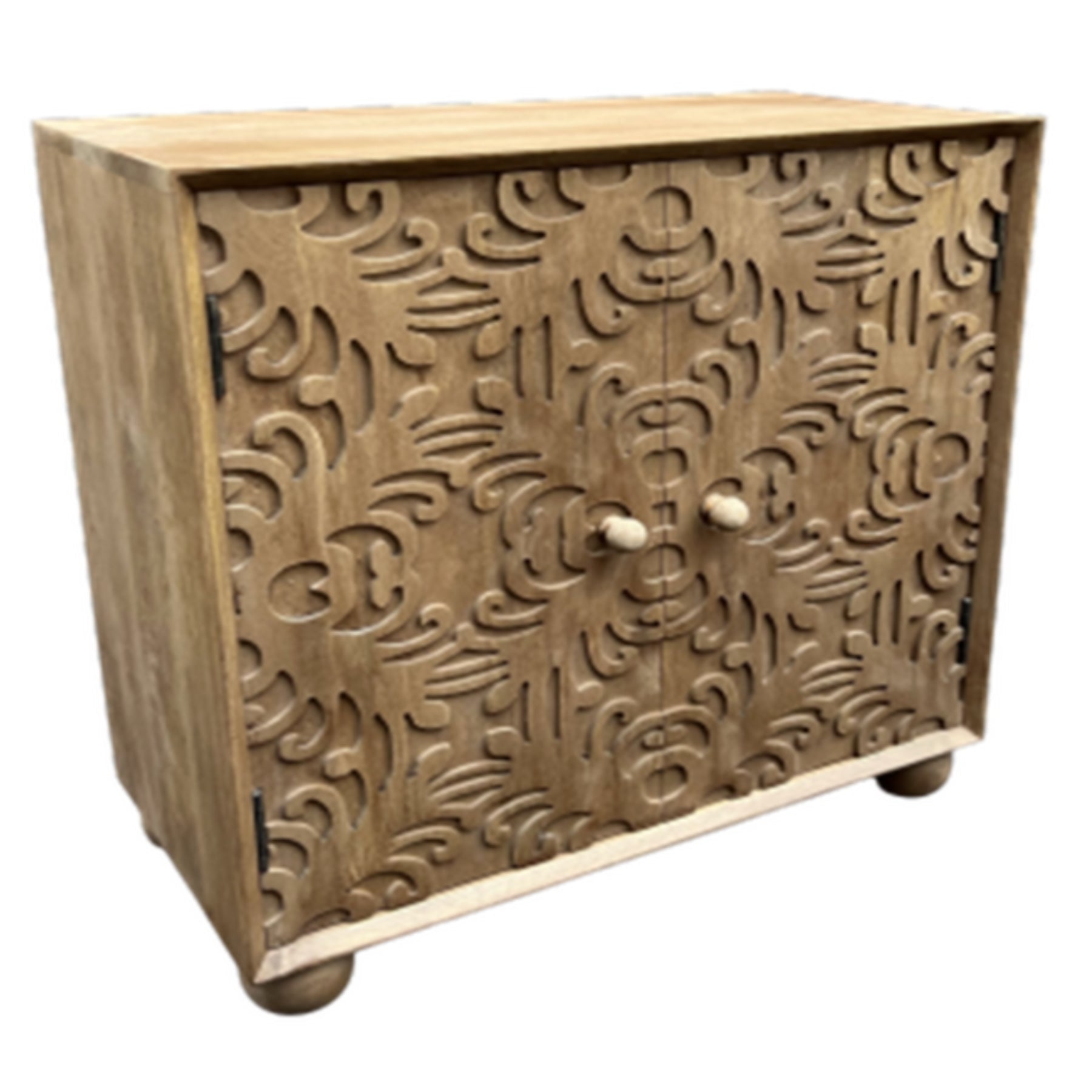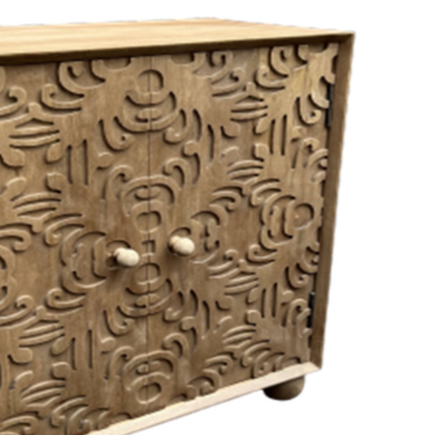 Expertly crafted from mango wood, the Elle Carved Sideboard features intricate scrollwork for a touch of elegance. But it's not just for show - the door also hides a convenient storage shelf for all your essentials.