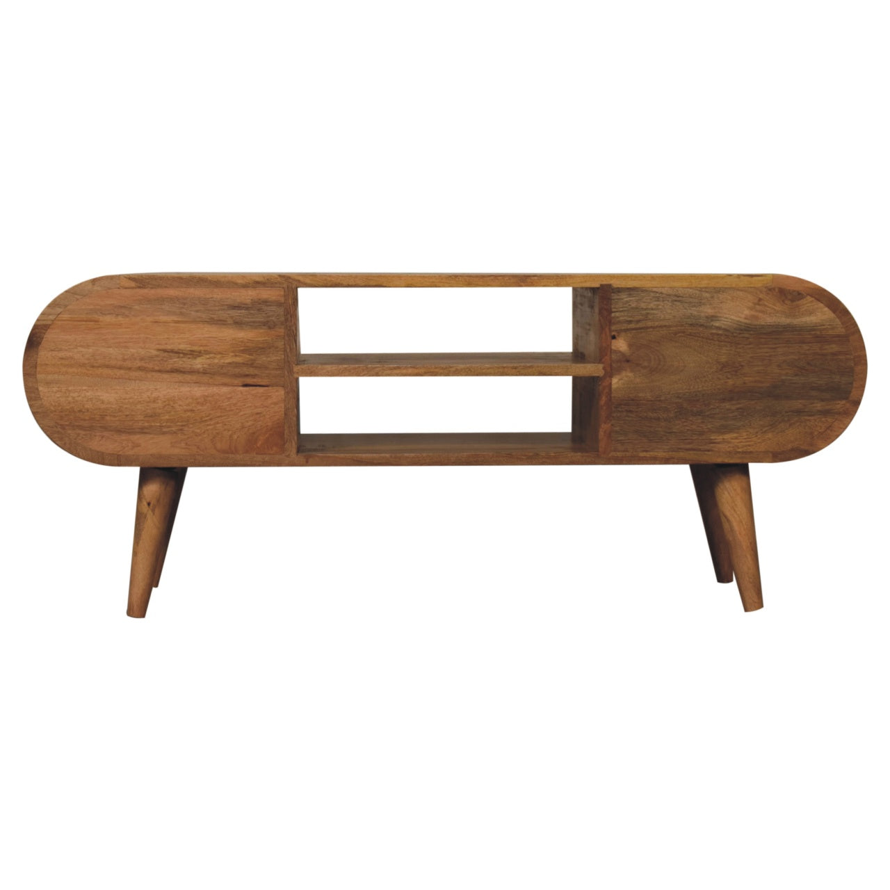 This round-style media unit has been constructed from 100% solid mango wood in an oak-ish finish. It features 2 shelves and 2 drawers, providing great storage and proving handy in the living room. Other notable features include 4 Nordic-style legs and shiny knobs on the drawers. It can be used alone or partnered with other rounded furniture pieces from the collection.