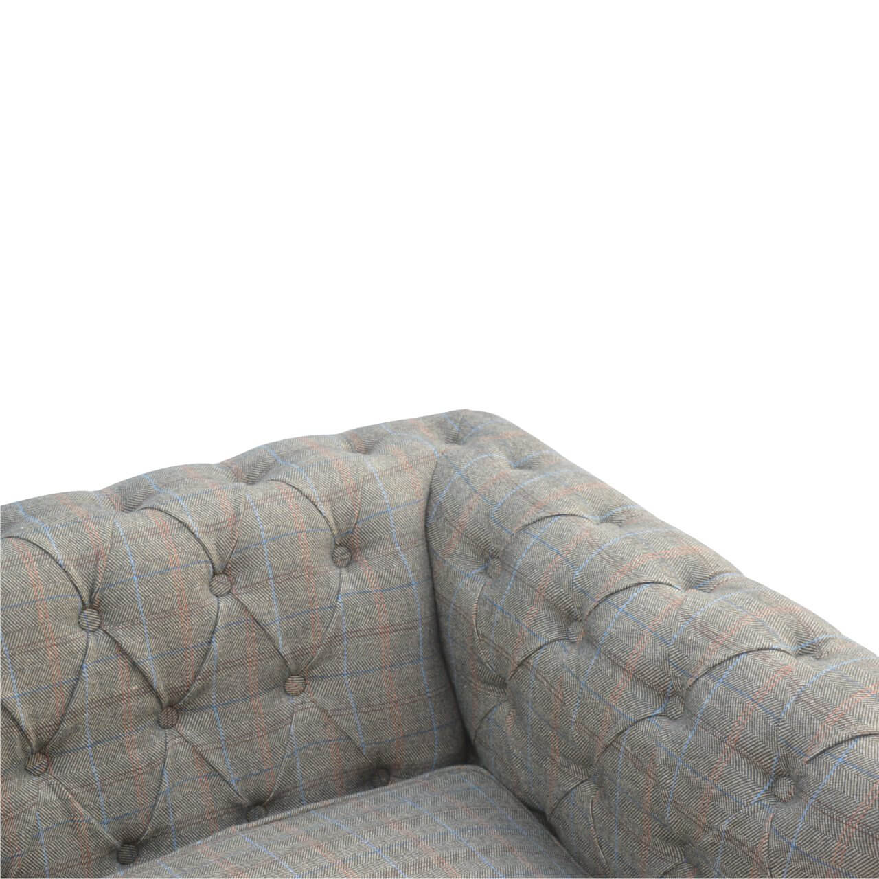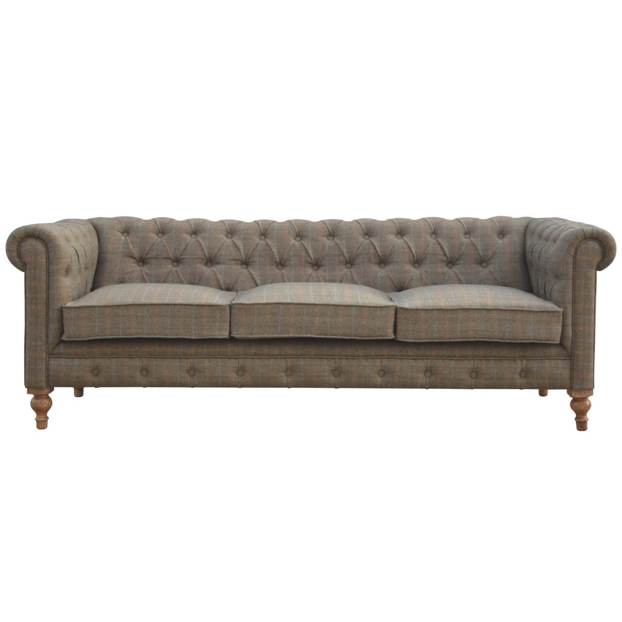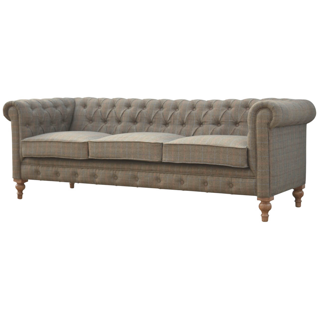 Our 3 Seater Chesterfield Sofa is a stylish and sturdy piece of furniture, crafted with a stunning tweed fabric and wooden mango wood frame. It offers a comfortable and spacious seating solution for up to three people. The sturdy construction ensures long-lasting durability and lasting style.