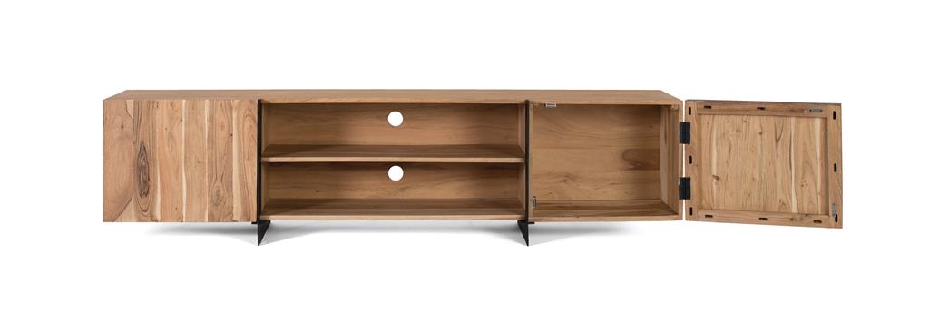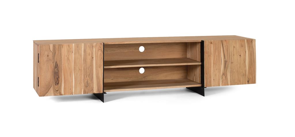 This stylish TV cabinet is made of solid acacia wood with metal accents in a natural color. As a natural wood piece, it may feature original knots and grains, adding character and charm to your space.