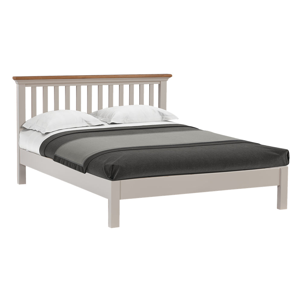 The Cotswold Kingsize Bed is crafted from painted pine, with a lacquered oak-topped headboard for a touch of elegance. The bed frame includes sprung slats to ensure a secure and comfortable night's sleep.
