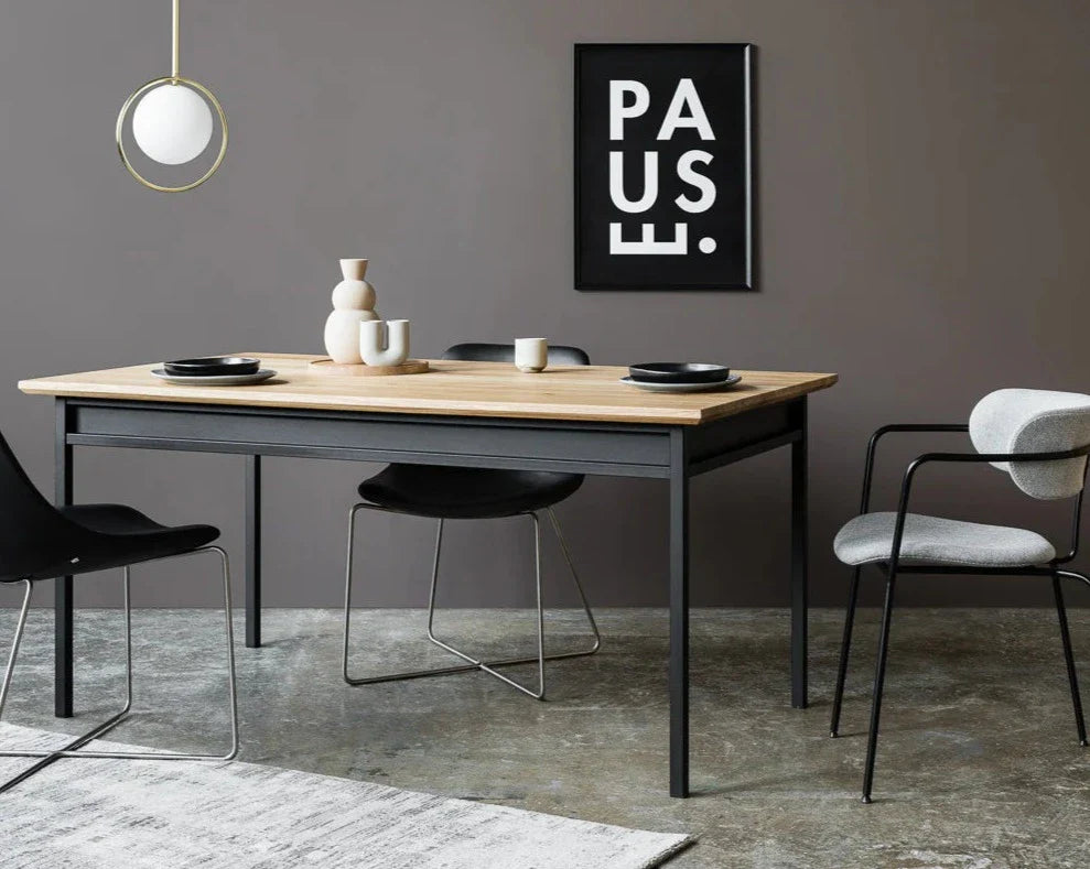 Introducing our Decora dining table, perfect for home spaces that value subtle delicacy and a refined soft-loft form. The decorative frame of the table is crafted from full metal sheet and steel profiles. Tabletop is made from Oak wood, with various wood and base finishes available for you to choose from.