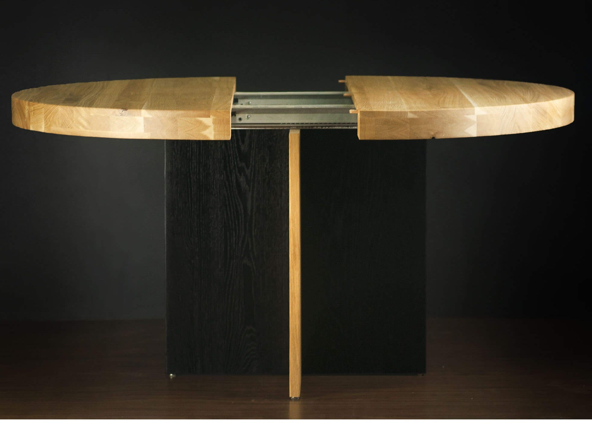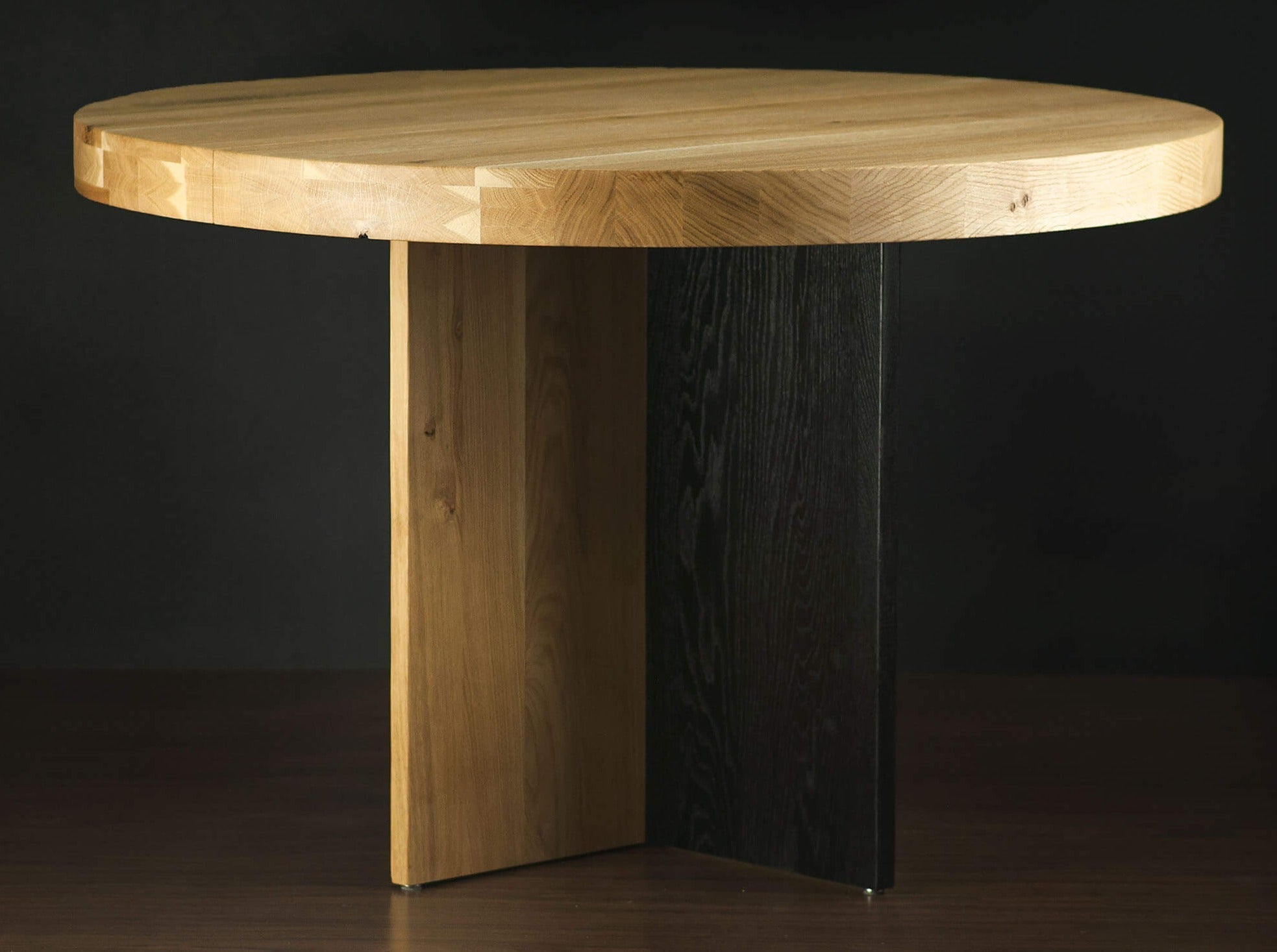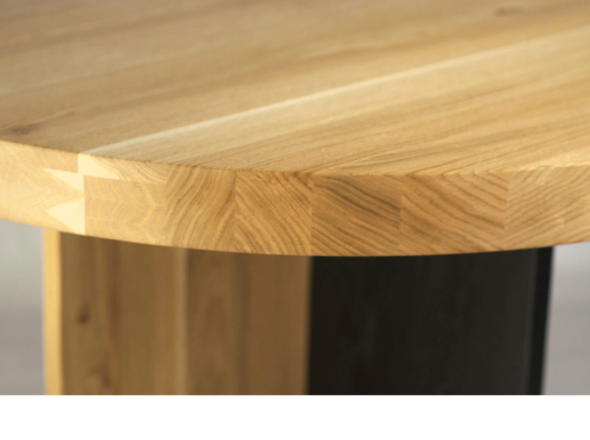 The Rosto round table is crafted from 100% solid oak. In its non-extendable version, the table top boasts a thickness of 4 cm.