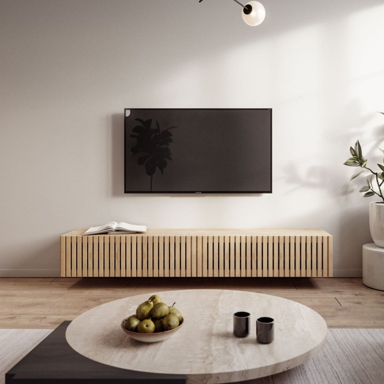 The openwork fronts of Latte are made of small oak slats, giving it an elegant character and allowing sound to pass through. This unique feature allows for the placement of a soundbar inside the cabinet, on a specially prepared shelf with a vertical partition. With Latte, you can enjoy your favorite movies with high-quality sound without having to worry about exposed speakers collecting dust and ruining the appearance of your interior. This suspended TV cabinet is not only aesthetically pleasing but also highly functional. The cabinet can be easily mounted on a wall rail, providing free access underneath for automatic vacuum cleaners.
