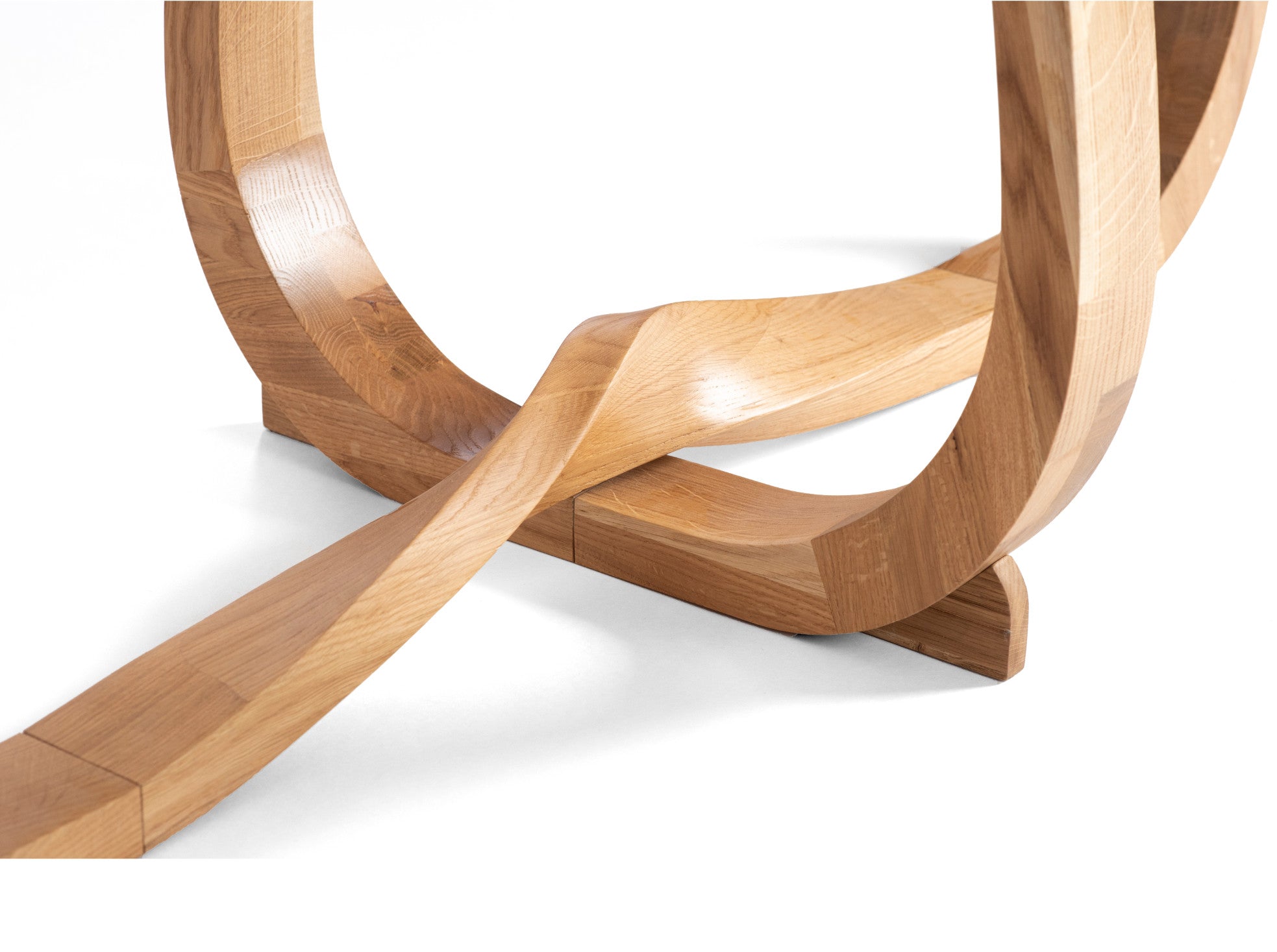 The two wooden loops interlocked with a permanent glue bond are constructed from wide slats that do not run lengthwise. The oval tabletop cutout lends an airy touch without compromising the table's noteworthy proportions.