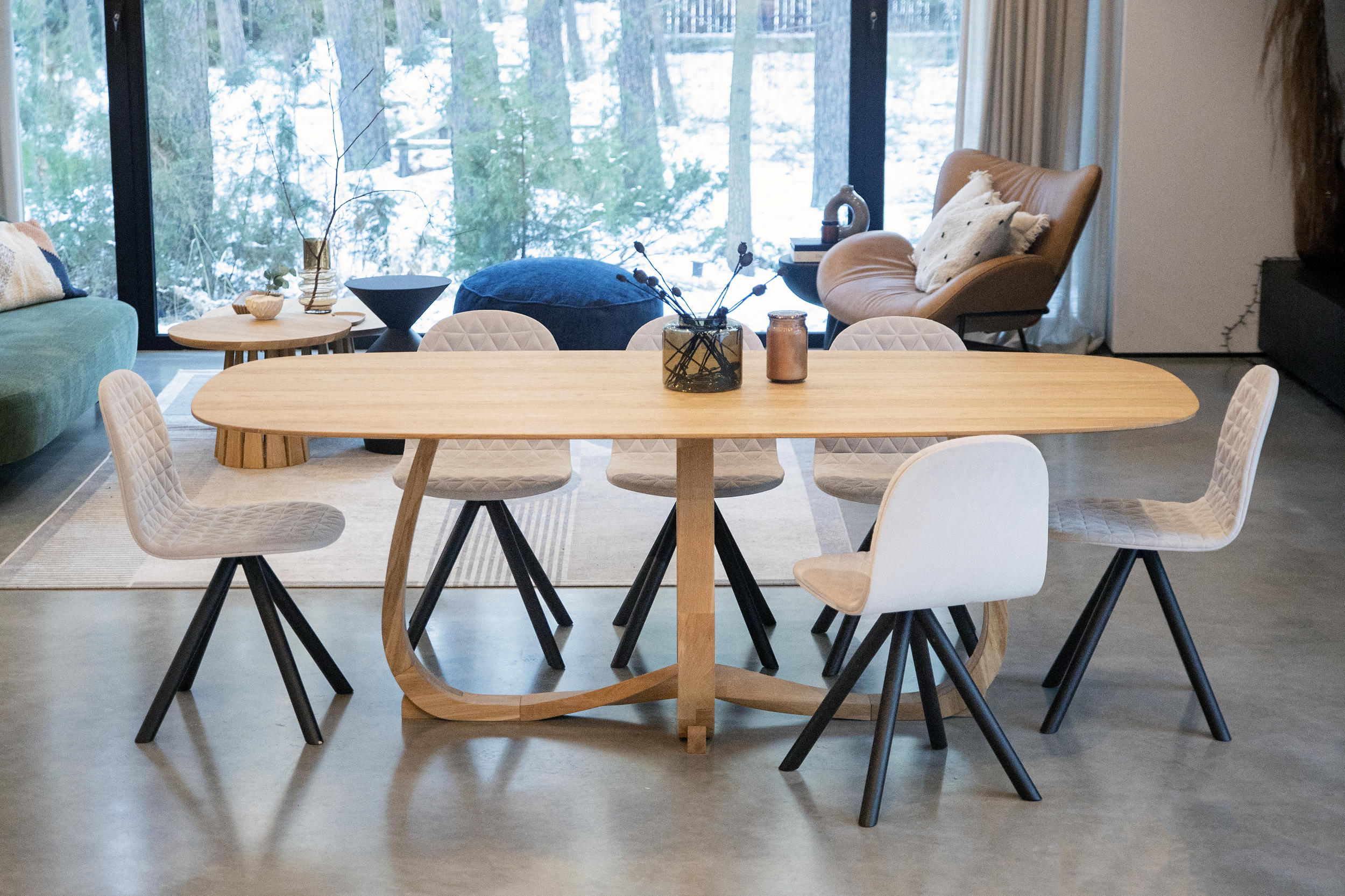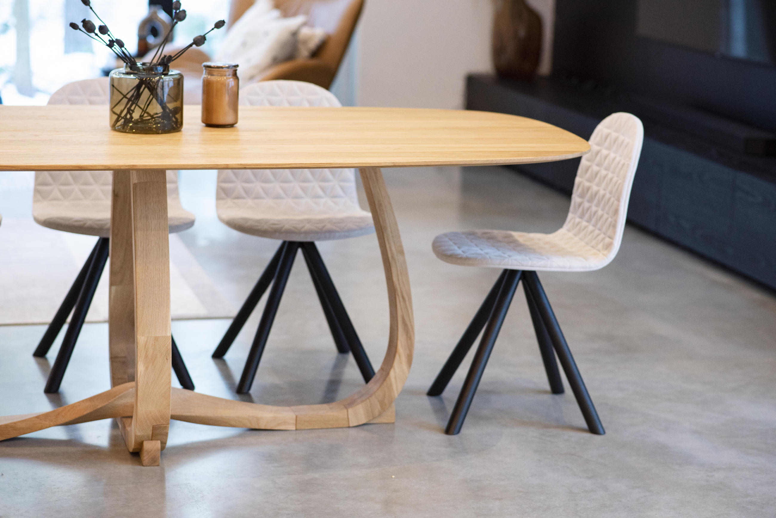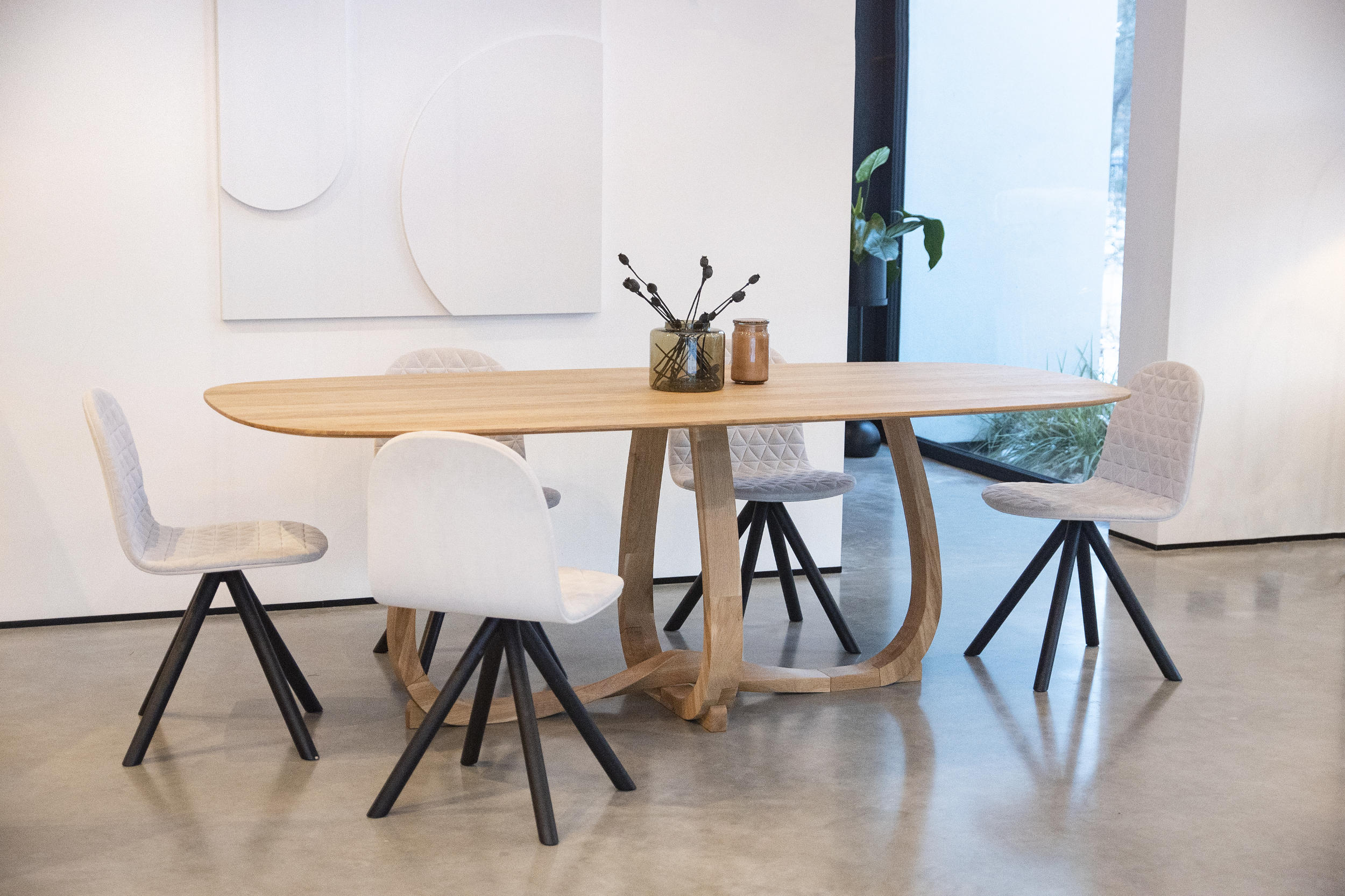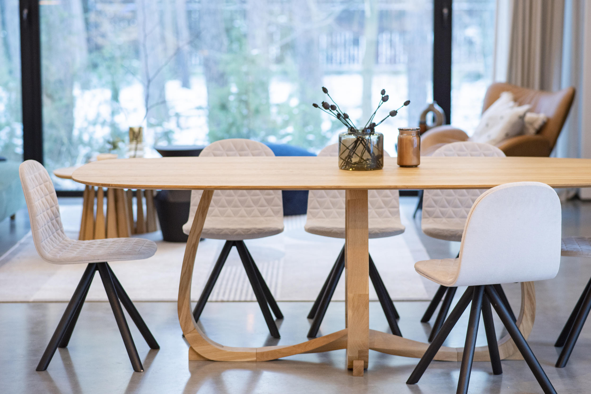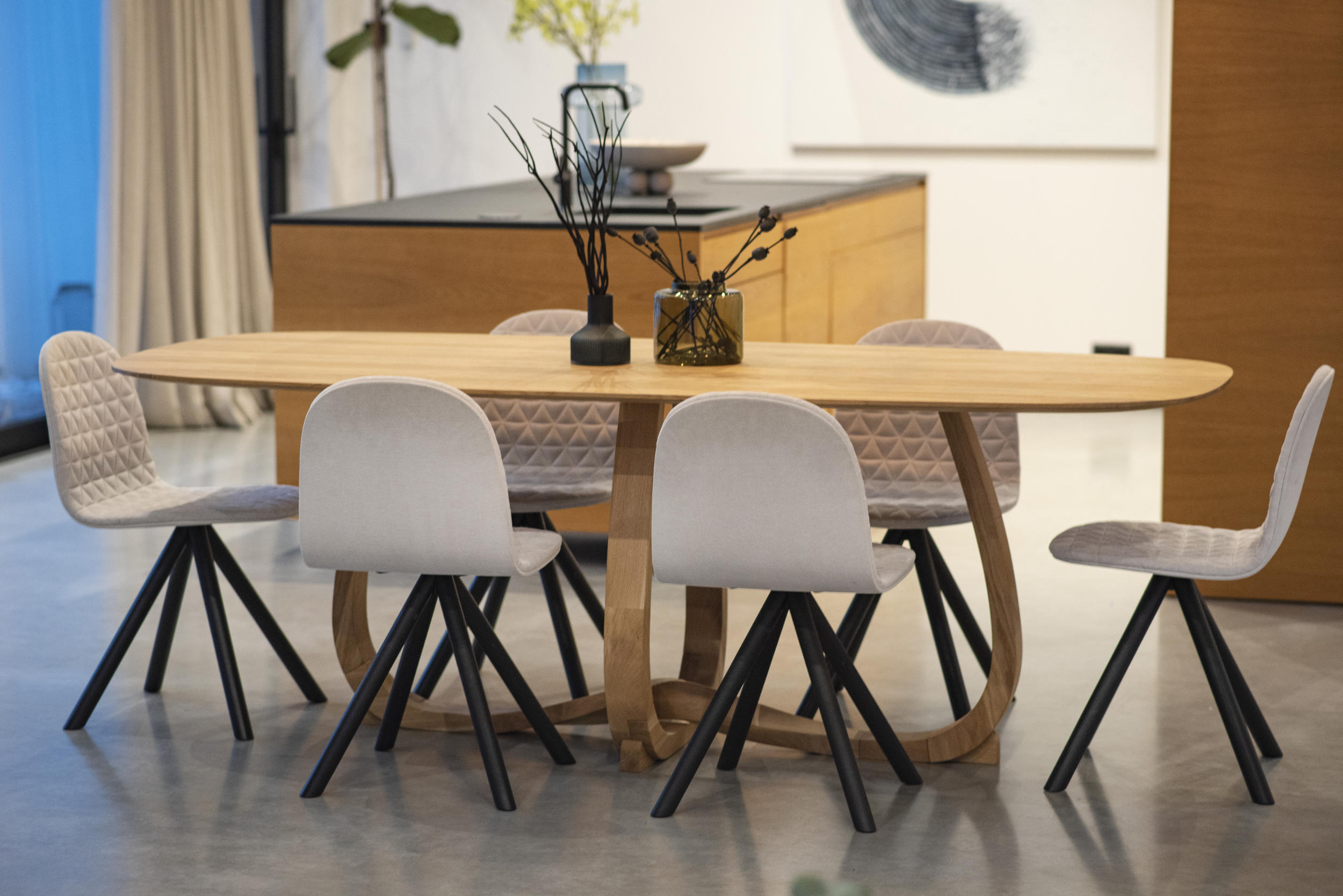 The most characteristic element of the table is the two elegant wooden loops intertwining in an artistic dance. The oval top, intricately milled, gives the table a distinctive character, simultaneously imparting a sense of lightness. Thanks to this delicate construction, the table becomes not only a practical dining spot but also an artistic masterpiece that draws the eye and delights.