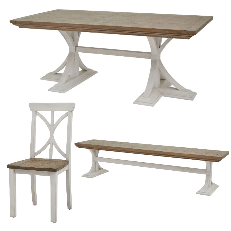 Combining rustic and contemporary design elements, this set features an off white painted bottom and a stained wooden top. Perfect for bringing style and functionality to your meals (and conversations)!
