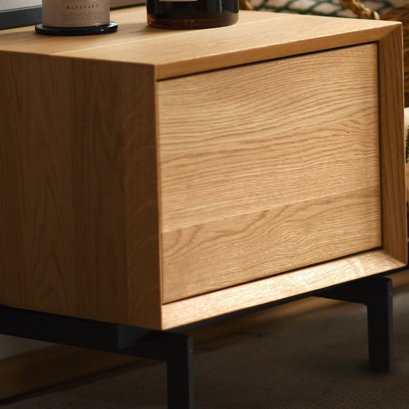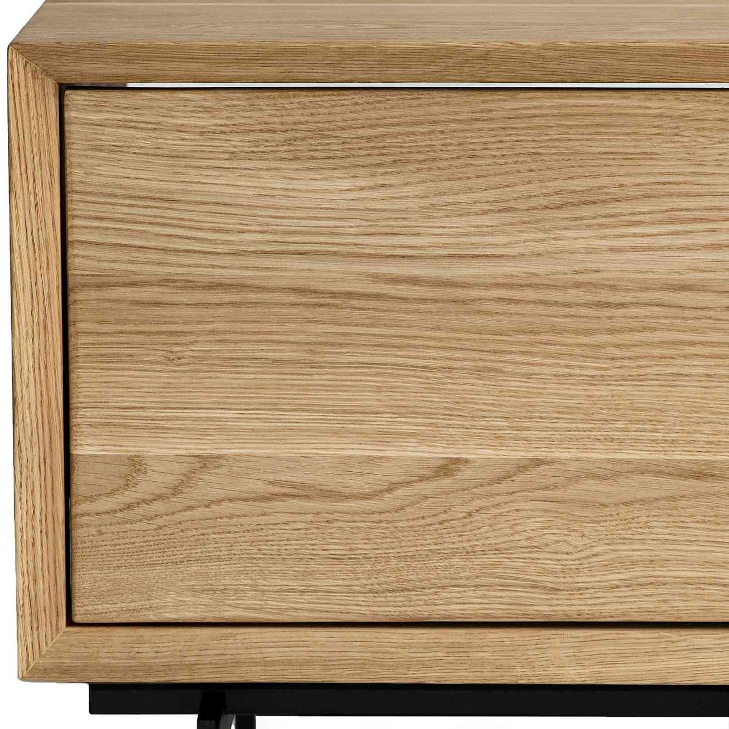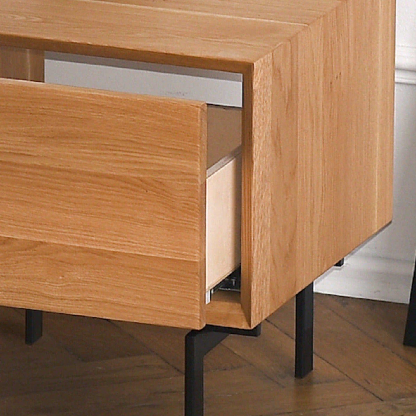 Its inner body construction ensures lightweight durability, while the plywood drawer, equipped with Blum slides and a tip-on system, offers convenient storage.