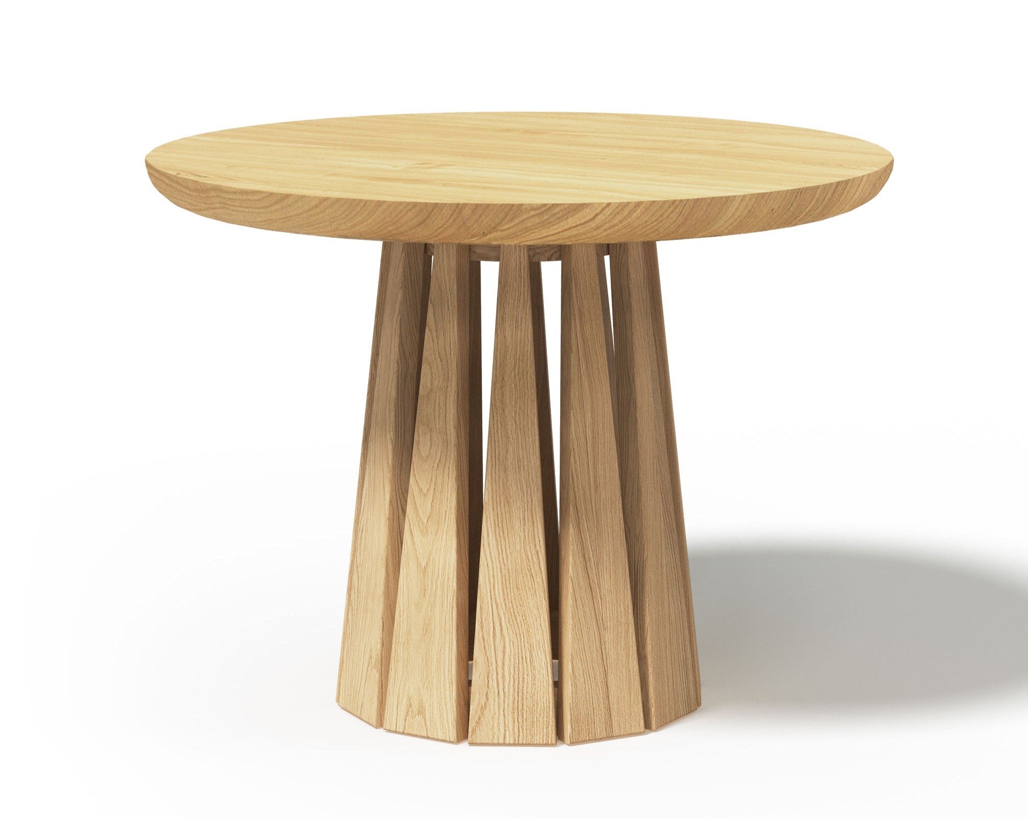 An elegant round table with an openwork base crafted from solid oak wood stands as a true masterpiece of craftsmanship. Its subtle design achieves a sense of lightness, courtesy of the precisely milled, rounded edge of the tabletop. Every detail of this furniture piece exudes meticulous workmanship, rendering it a focal point in any interior space.